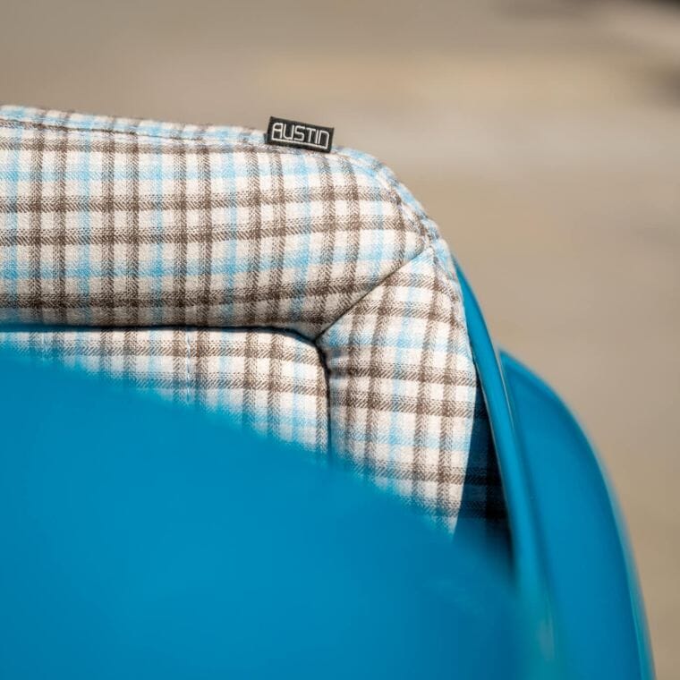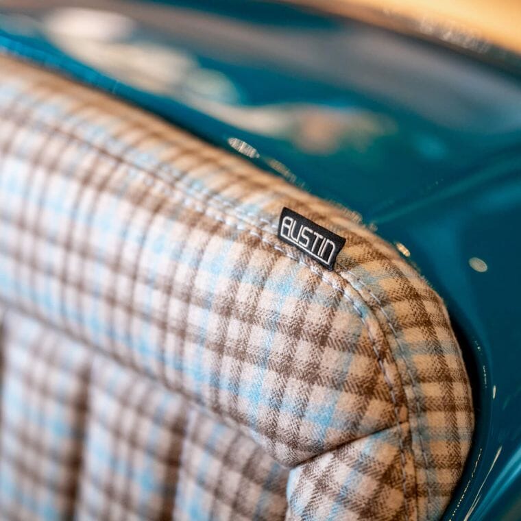 Using the finest Holland & Sherry cloth, the bespoke interior features a sumptuous, individually designed, Holland & Sherry tailored seat, perfectly complimented by a handbrake gaiter trimmed to match. The fabric, chosen to compliment the stunning turquoise paintwork, has also been used to trim unique Austin accessories including a fine leather satchel and a specially created tool-roll.