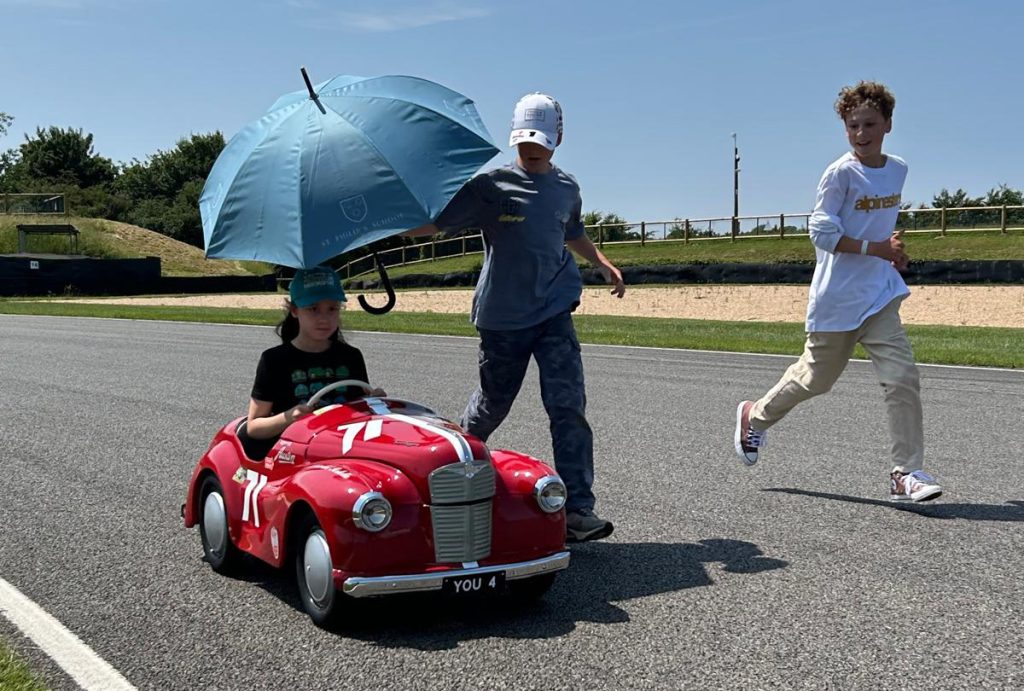 With pure pedal power and determination, Alyssa navigated Goodwood Motor Circuit’s famous bends, straights, and challenging chicane in a classic red Austin J40 pedal car.