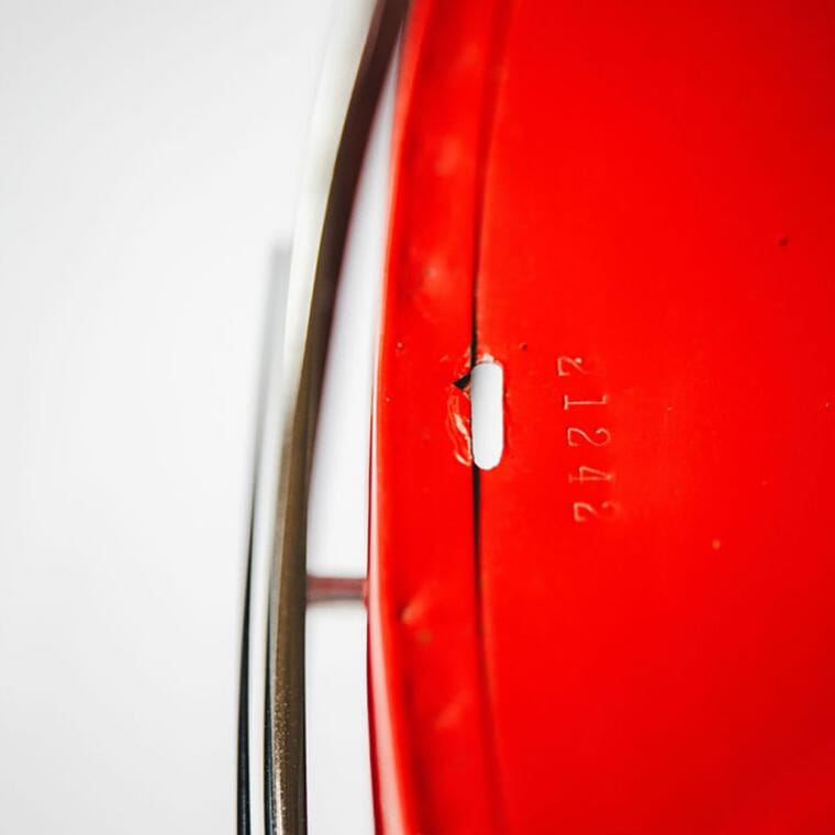 Exterior - Red paintwork over cream wheels and polished aluminium hub caps.