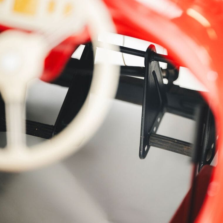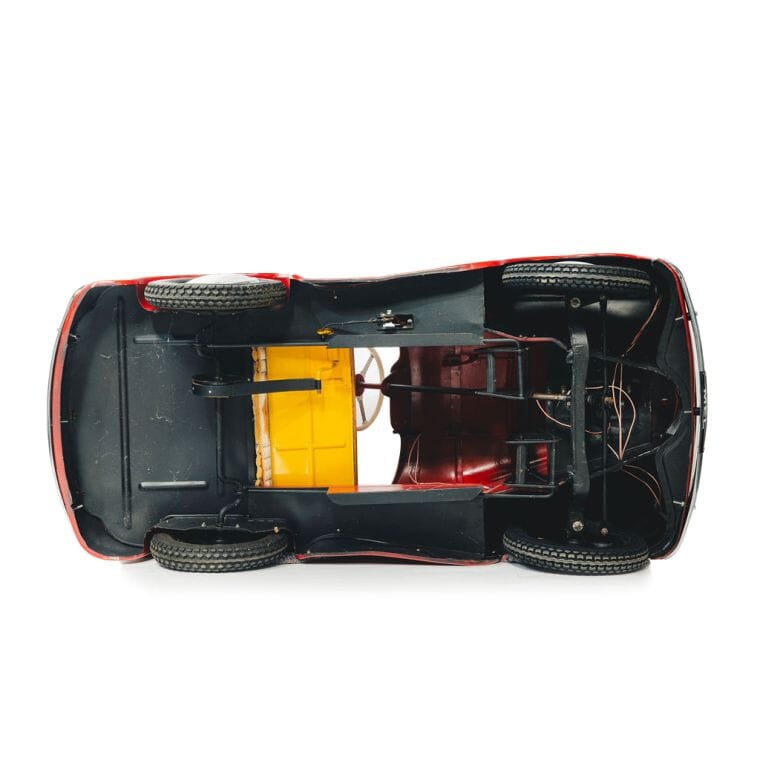 A restored red Austin J40 Pedal Car, previously restored and is ready for pedalling and refined enough for display.